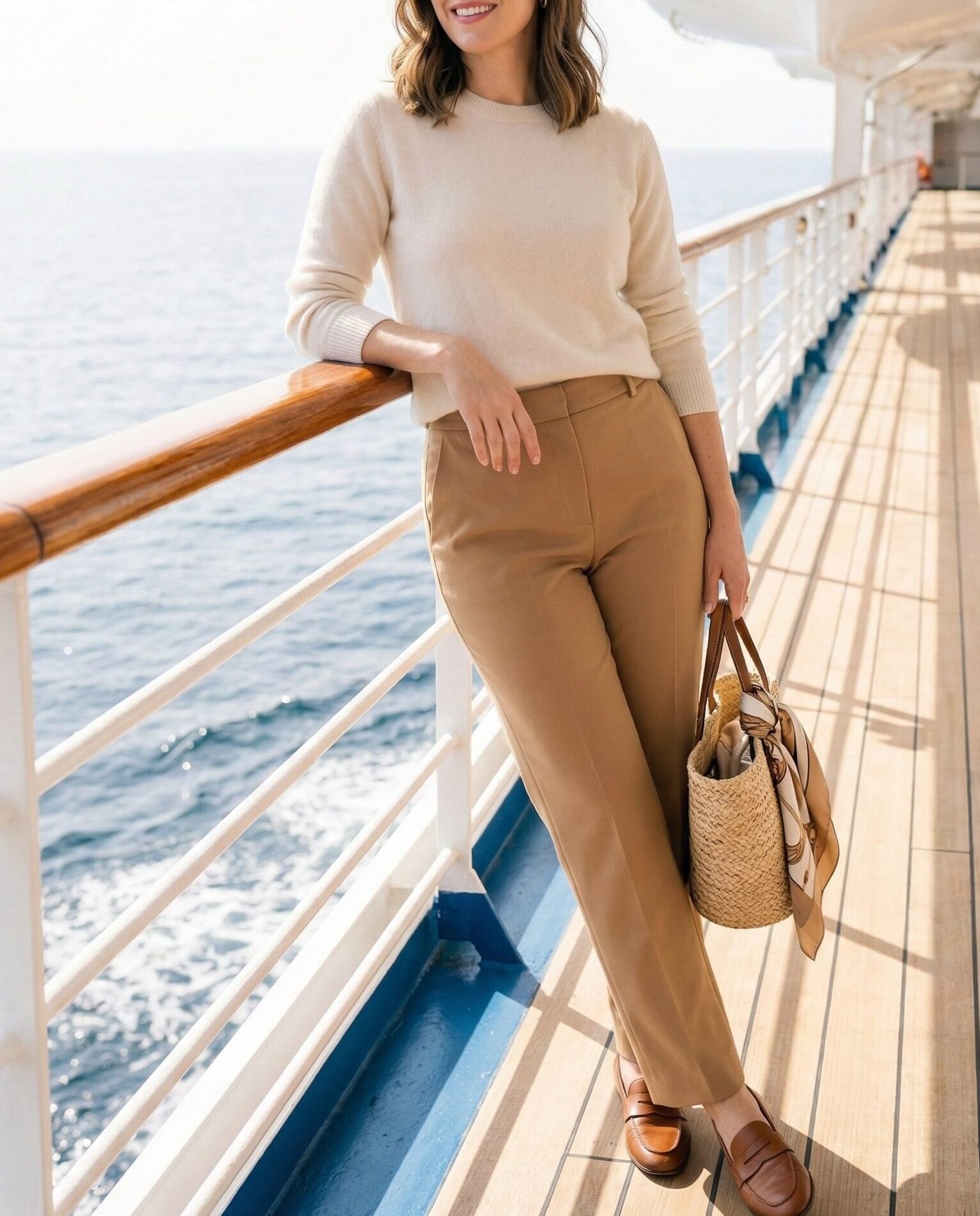 A soft knit top paired with straight-leg trousers creates a polished yet relaxed cruise outfit. It’s comfortable enough for walking around the ship and stylish enough for casual dining or onboard activities.