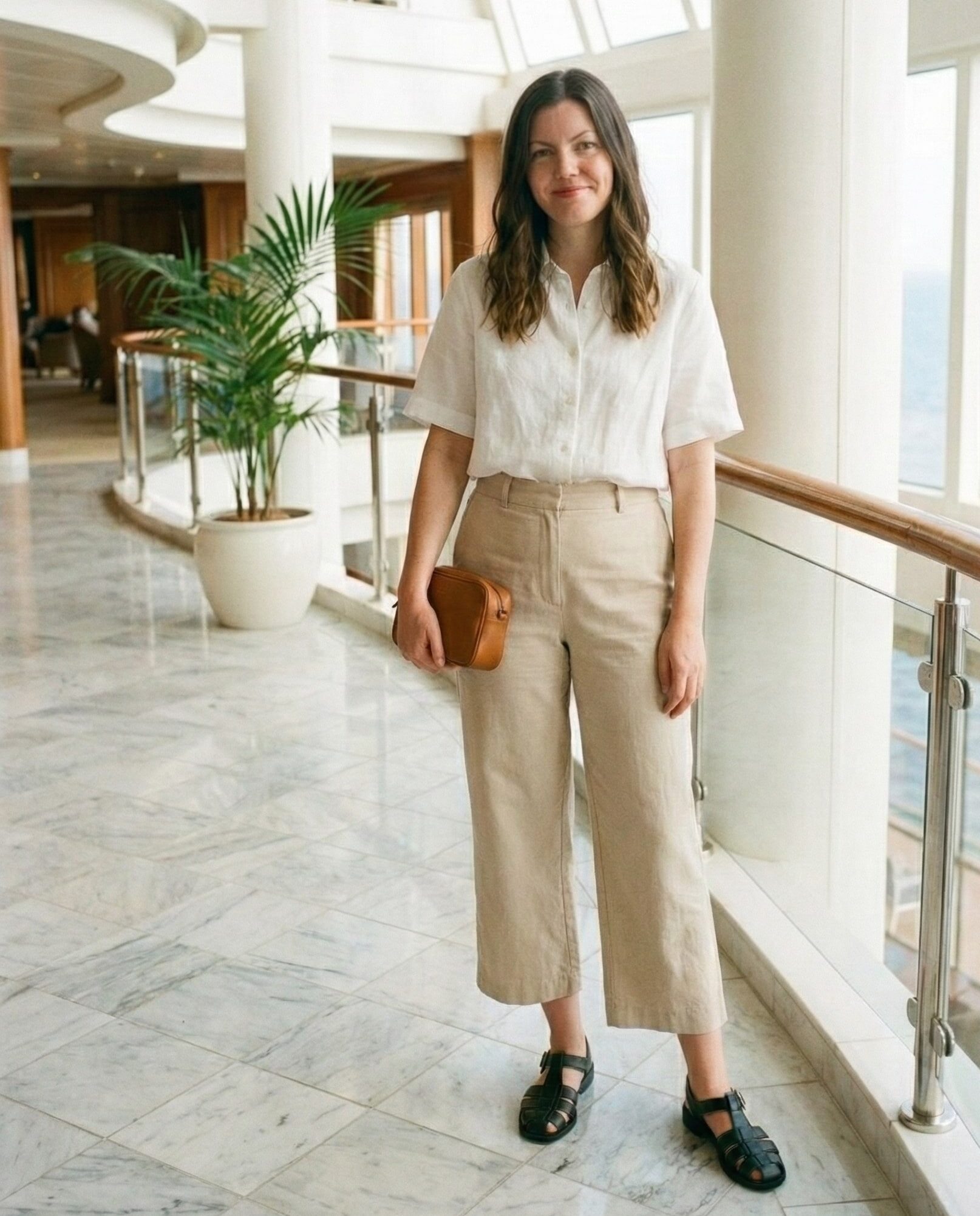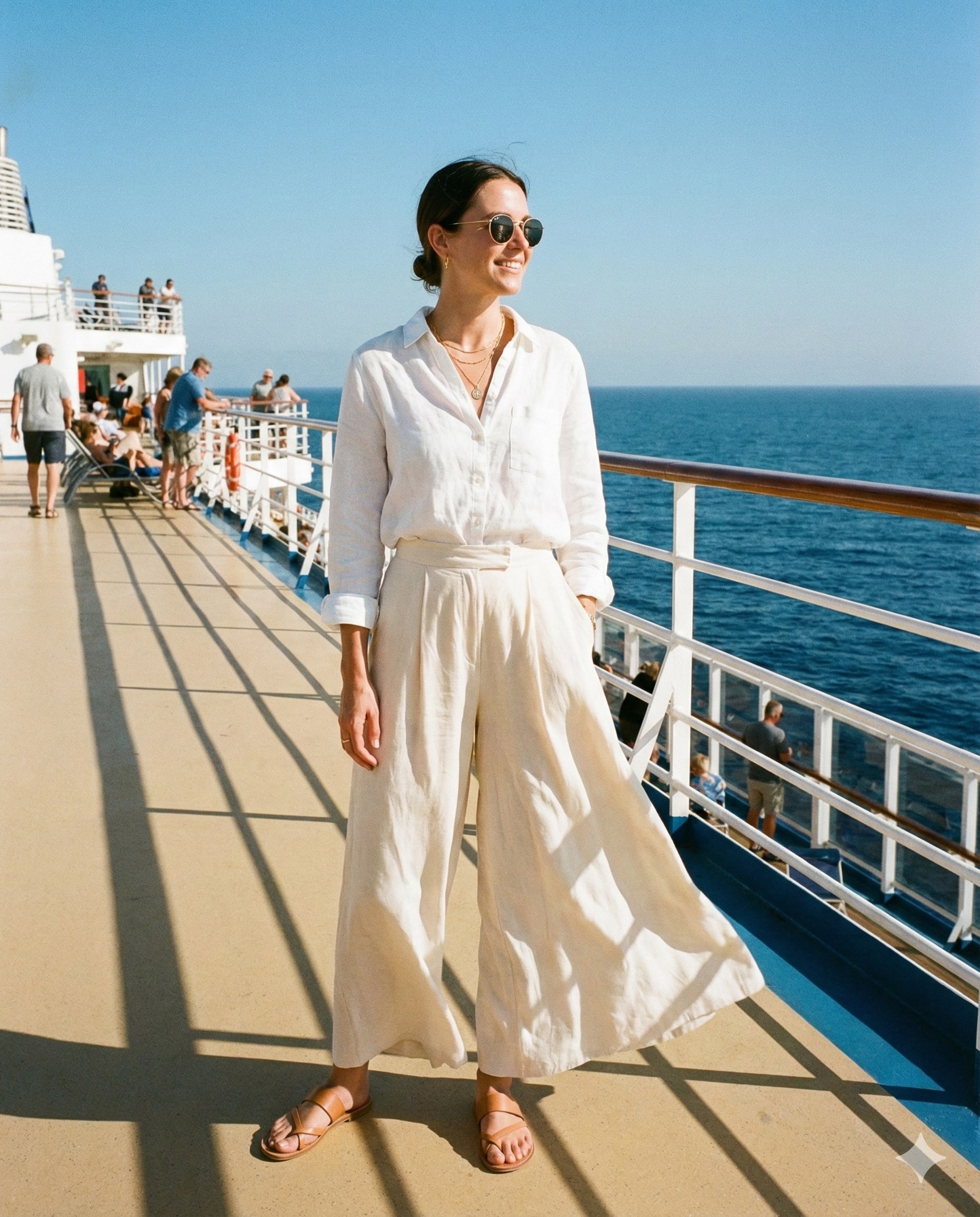 Linen keeps you cool while wide-leg pants add elegance. This outfit is perfect for walking the ship, enjoying deck views, or attending casual daytime events.