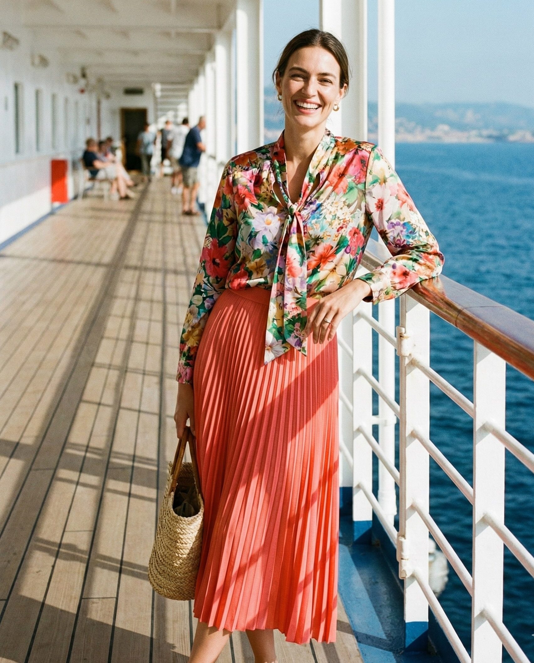 A printed blouse adds personality while a midi skirt keeps the look modest and elegant. This outfit feels cheerful and fashionable—perfect for daytime events, port days, or evening strolls on deck.