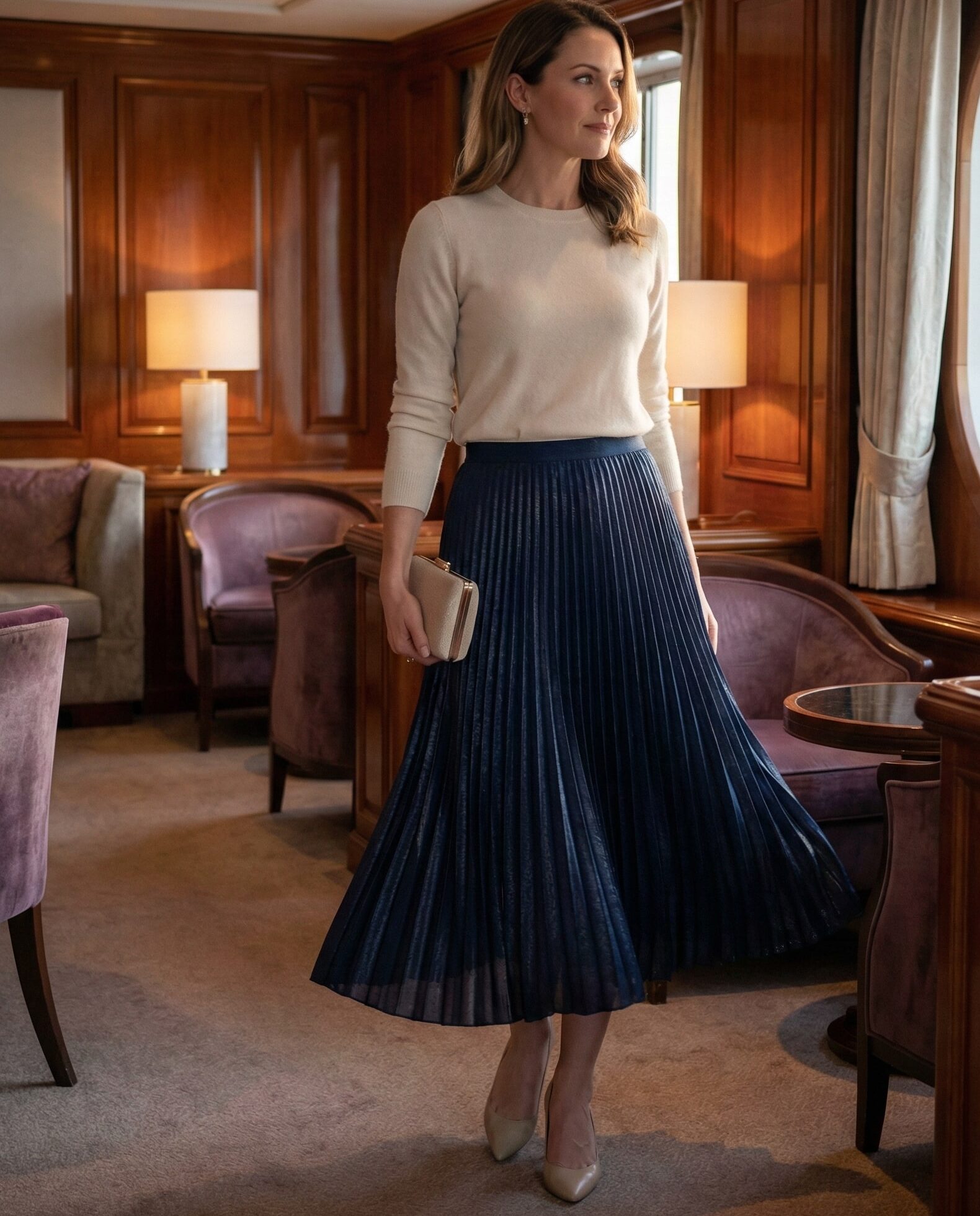 Elegant and comfortable, this outfit is ideal for evening dining or performances. The pleated skirt adds movement, while the sweater keeps things cozy.