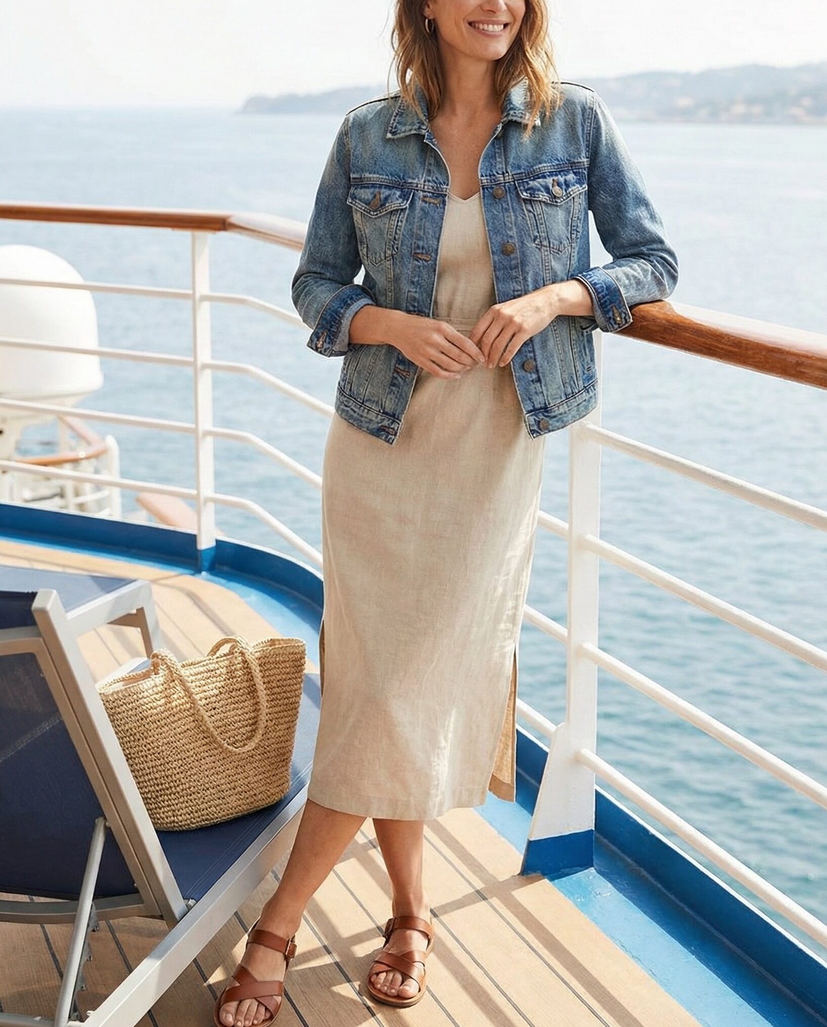 A denim jacket adds structure and warmth. Layer it over a neutral dress for a stylish outfit that works in both indoor and outdoor cruise settings.