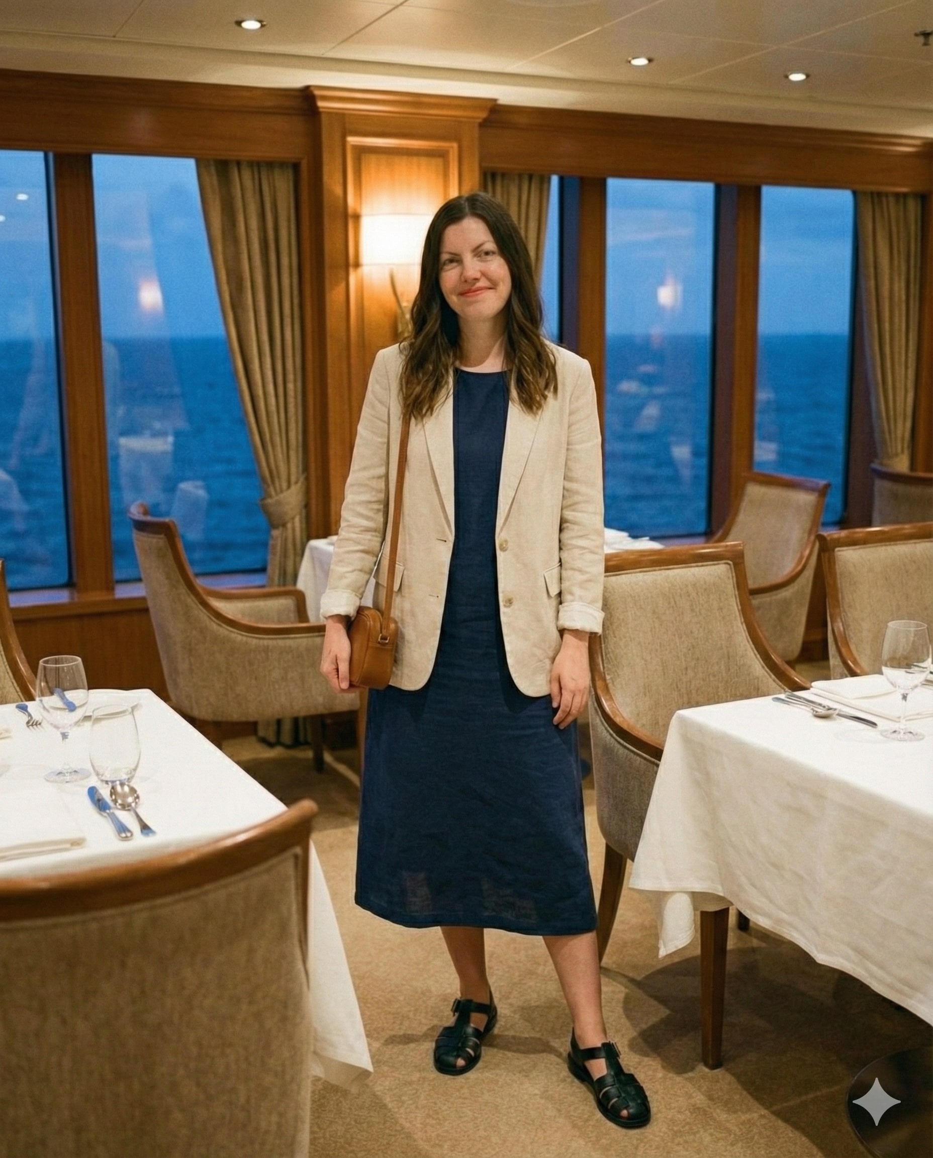 Clean and classic, this outfit works beautifully for onboard dinners or events. It’s polished without feeling formal and comfortable enough for all-day wear.