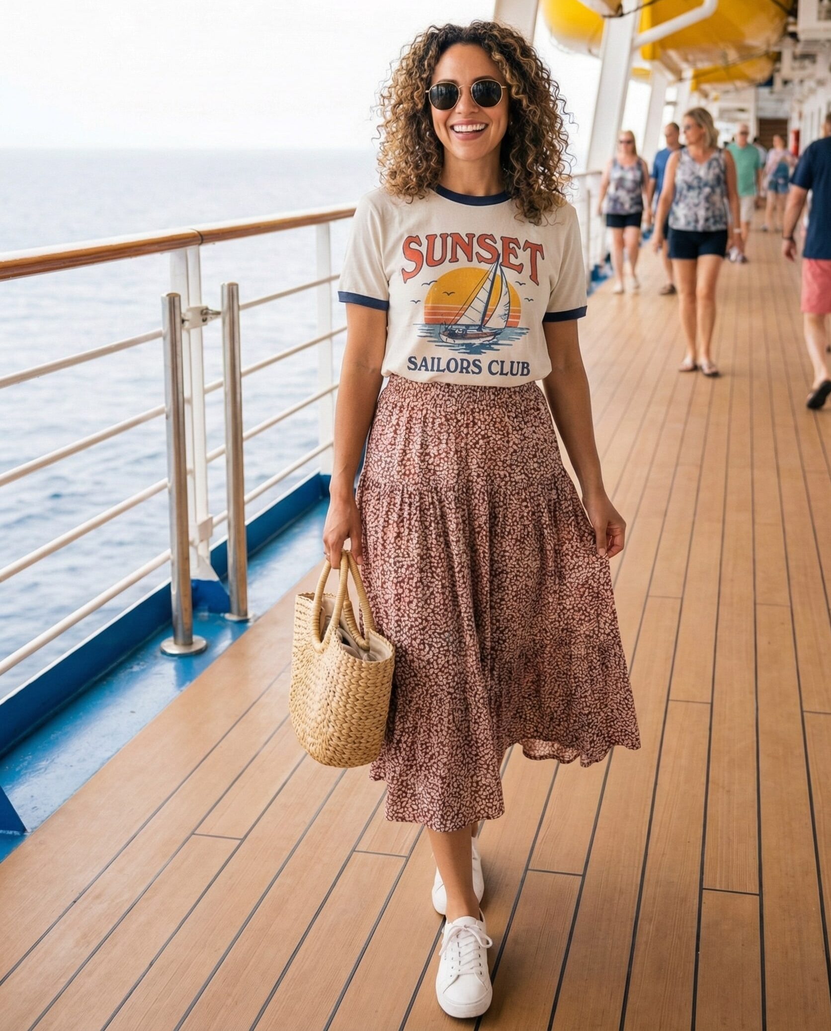 A graphic tee adds personality, while a flowy skirt keeps the look polished. This outfit feels playful yet modest—ideal for casual cruise days and photo moments.