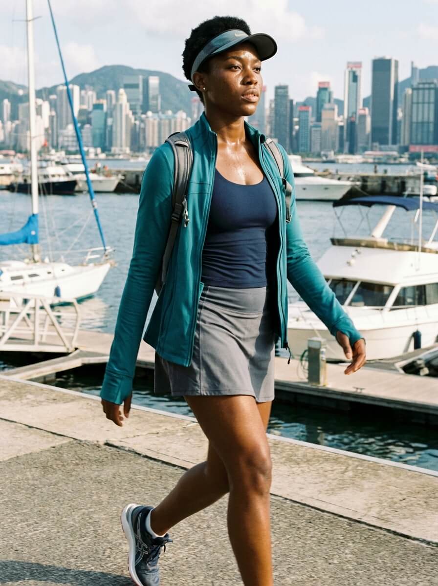 A zip-up athletic jacket over a fitted tank, paired with flowy tennis-style skort. Running shoes keep it functional, while a sleek backpack and visor add polish. One of the most wearable summer outfit ideas for active days.