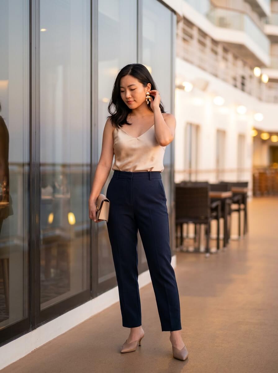 A silky champagne camisole tucked into high-waisted navy trousers. Pointed-toe mules elongate the silhouette, while a structured clutch and statement earrings elevate it. One of those women’s summer fashion staples that transitions seamlessly.