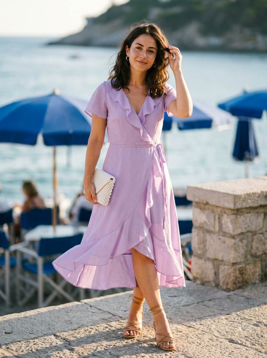 A flowy lavender wrap dress with soft ruffles moves beautifully in the wind. Pair with strappy flat sandals, a pearl-embellished clutch, and dainty earrings. Feminine, relaxed, and one of those cute summer looks that always feels right.