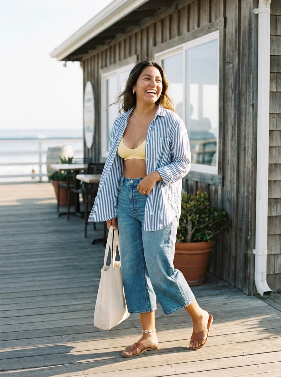 A breezy striped linen button-down worn open over a butter-yellow bralette, paired with relaxed denim culottes. Leather slide sandals and a canvas tote finish it. Add a shell anklet for a subtle nod to coastal summer outfit ideas.