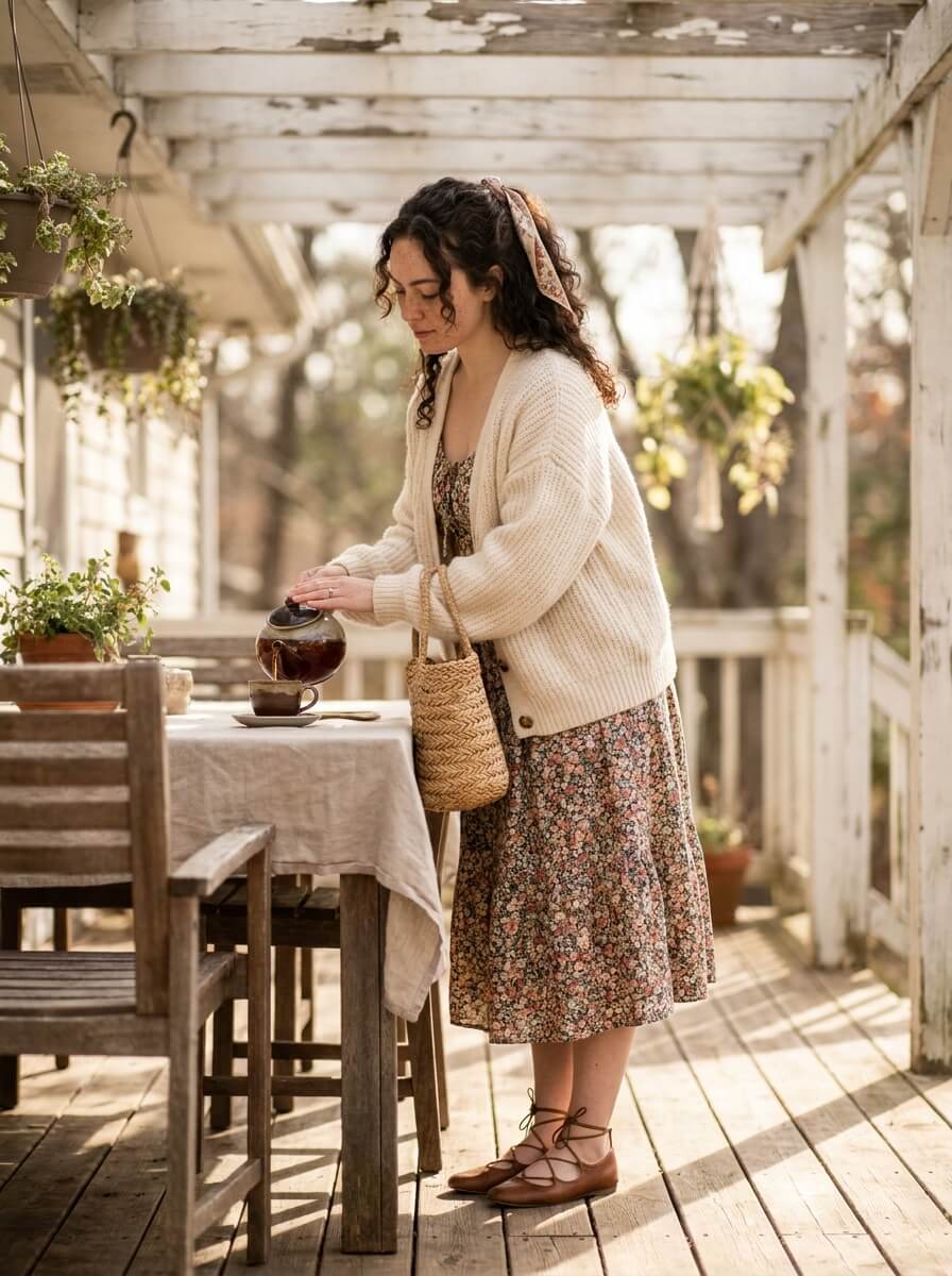 A soft floral midi dress layered with a chunky cream cardigan. Add lace-up flats, a woven basket bag, and a ribbon hair tie. Sweet, cozy, and ideal for quiet afternoon tea onboard.