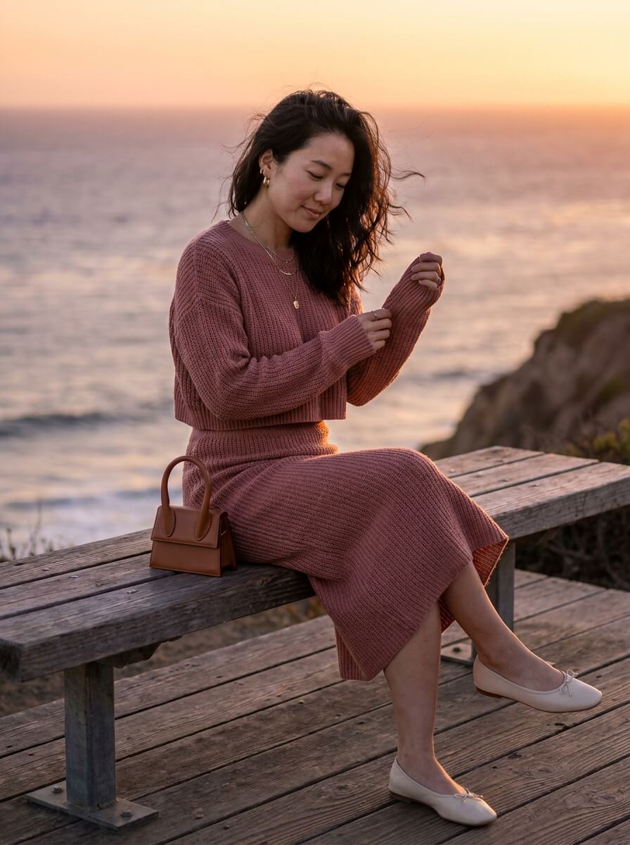 A dusty rose knit co-ord — cropped sweater and matching midi skirt — feels cozy yet polished. Style with ballet flats, a mini top-handle bag, and delicate gold jewelry. Ideal for golden hour walks when the temperature dips.