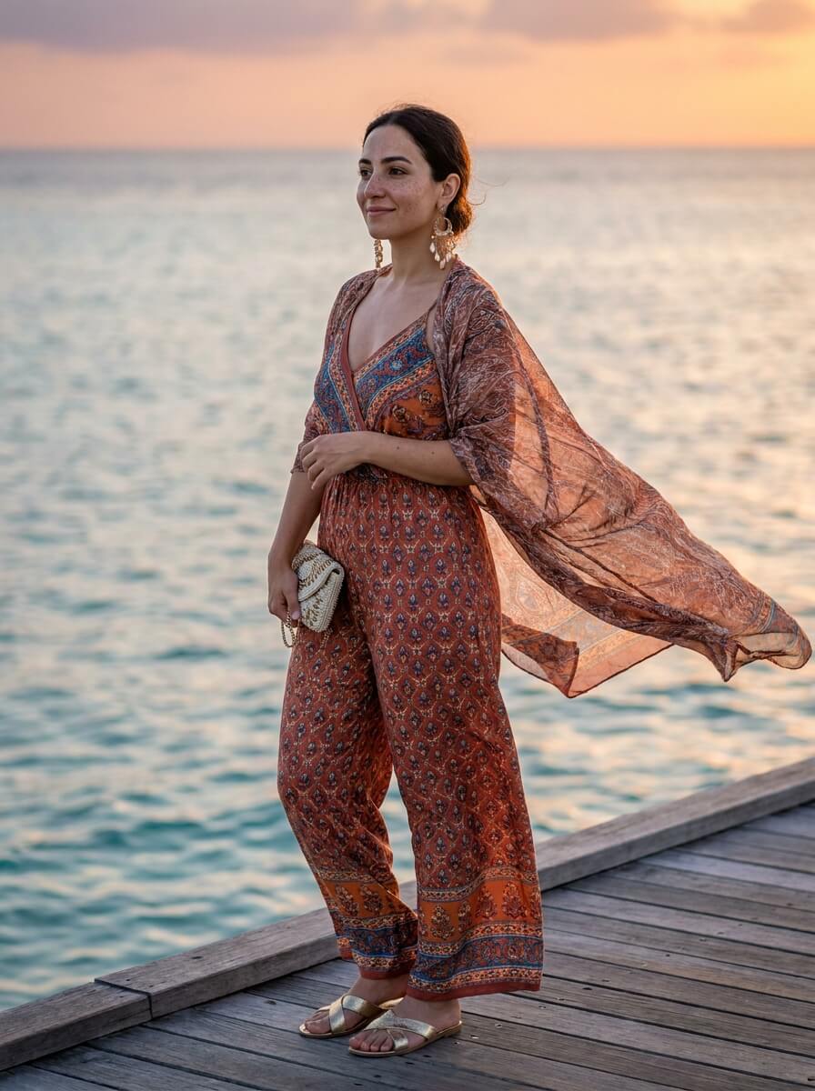 A bold printed wide-leg jumpsuit in sunset tones makes the statement. Add metallic sandals, a beaded clutch, and oversized earrings. The unexpected layer? A sheer shawl for movement and warmth as the evening cools.