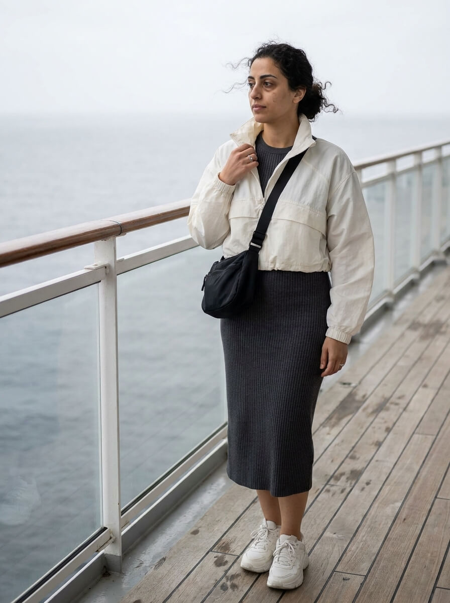 A charcoal ribbed midi dress hugs without clinging, layered under a cropped ivory windbreaker. Chunky white sneakers keep it grounded, with a sleek nylon crossbody and silver hoops. Clean, practical, and quietly stylish for breezy sea days.