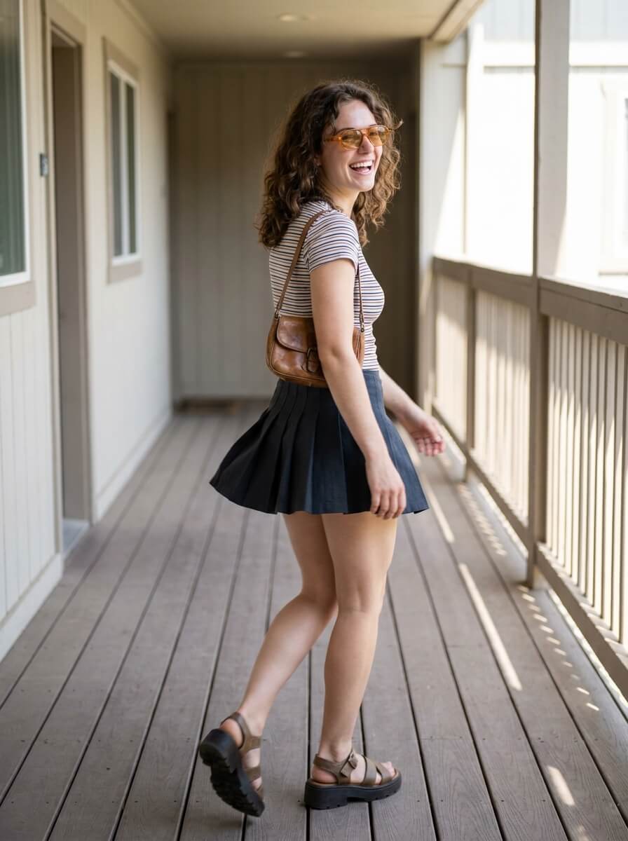 A fitted baby tee with a subtle graphic pairs with a pleated mini skort. Platform sandals add height, while a mini shoulder bag and tinted sunglasses complete the vibe. Playful, nostalgic, and surprisingly cruise-appropriate.