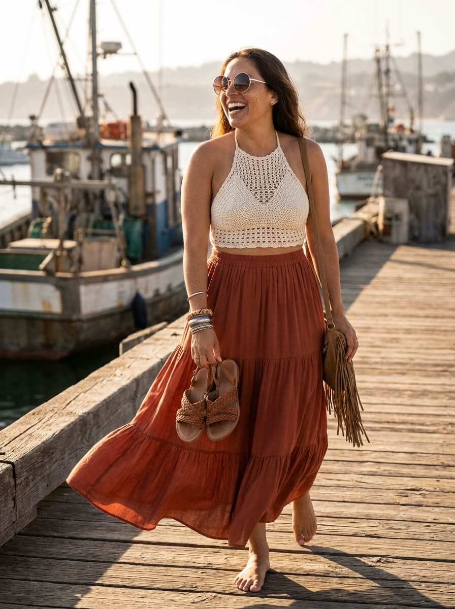 A rust-toned tiered maxi skirt pairs with a crochet halter top. Slip into braided leather sandals and carry a fringe crossbody. Layer with stacked bangles and oversized sunnies — effortless boho for port day wandering.