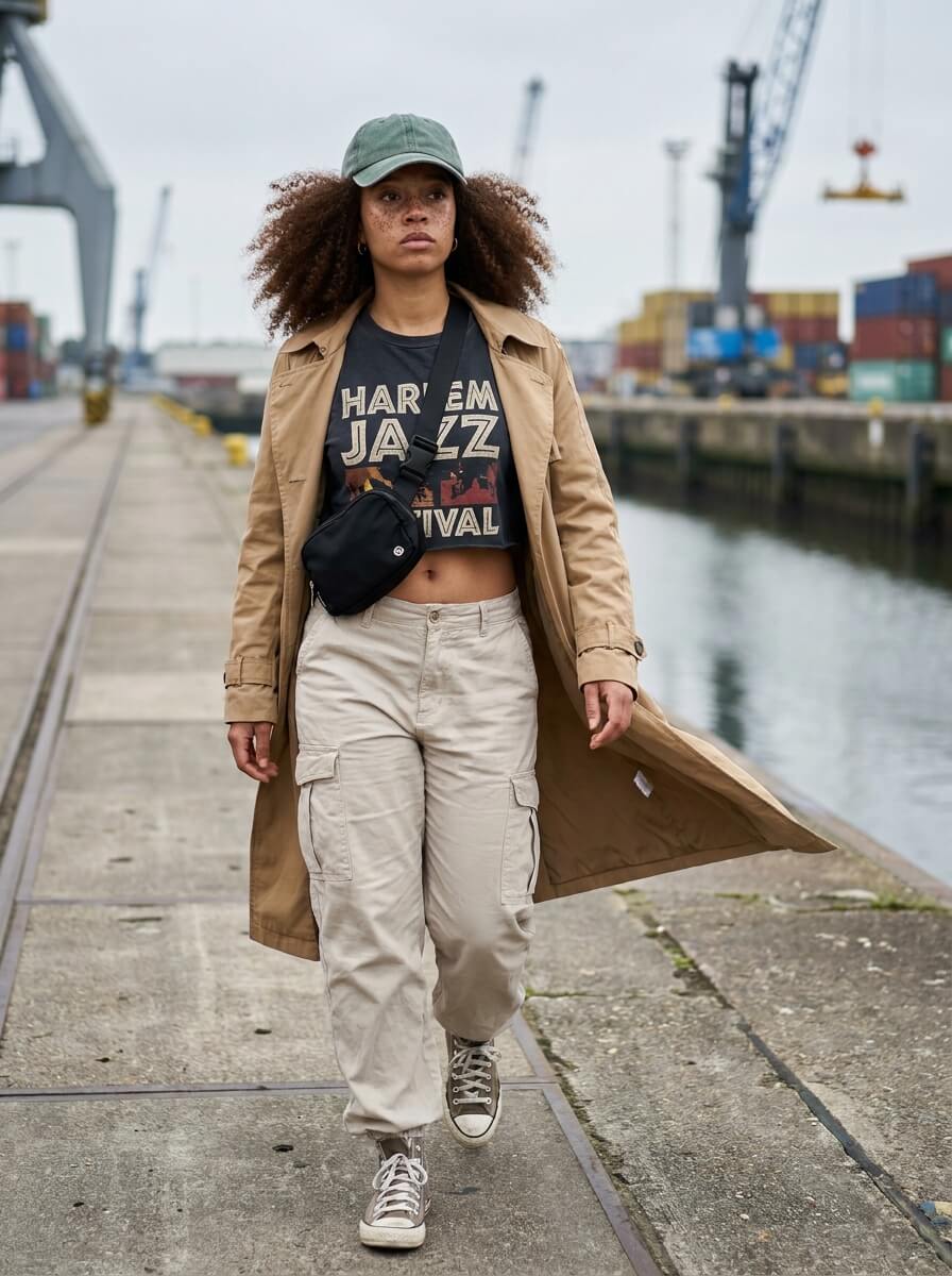 A cropped graphic tee pairs with utility cargo pants in stone beige. Add high-top sneakers, a sporty belt bag, and a baseball cap. The unexpected twist? A lightweight trench layered open for that elevated streetwear edge.