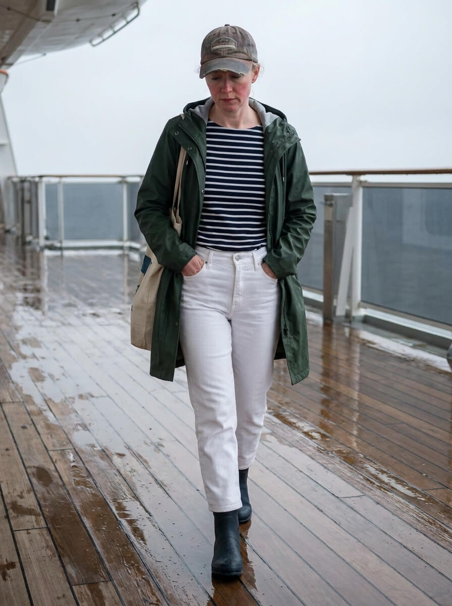 A navy Breton striped top tucked into straight-leg white jeans. Layer with a sage waterproof parka. Finish with rubber ankle boots, a structured tote, and a baseball cap — practical without losing style.