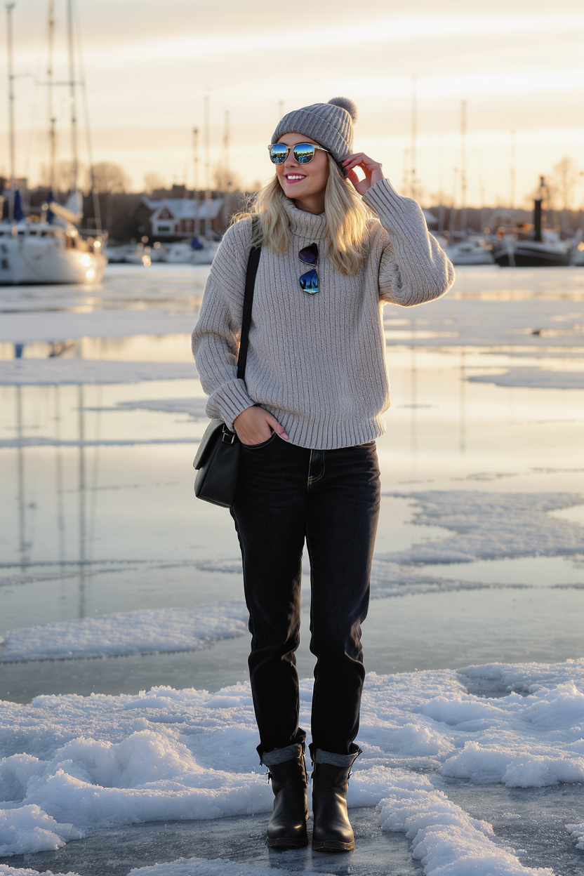 A soft merino wool sweater layered over a breathable long-sleeve tee, paired with straight-leg dark denim. Waterproof ankle boots ground the look, while a crossbody bag keeps things hands-free.
