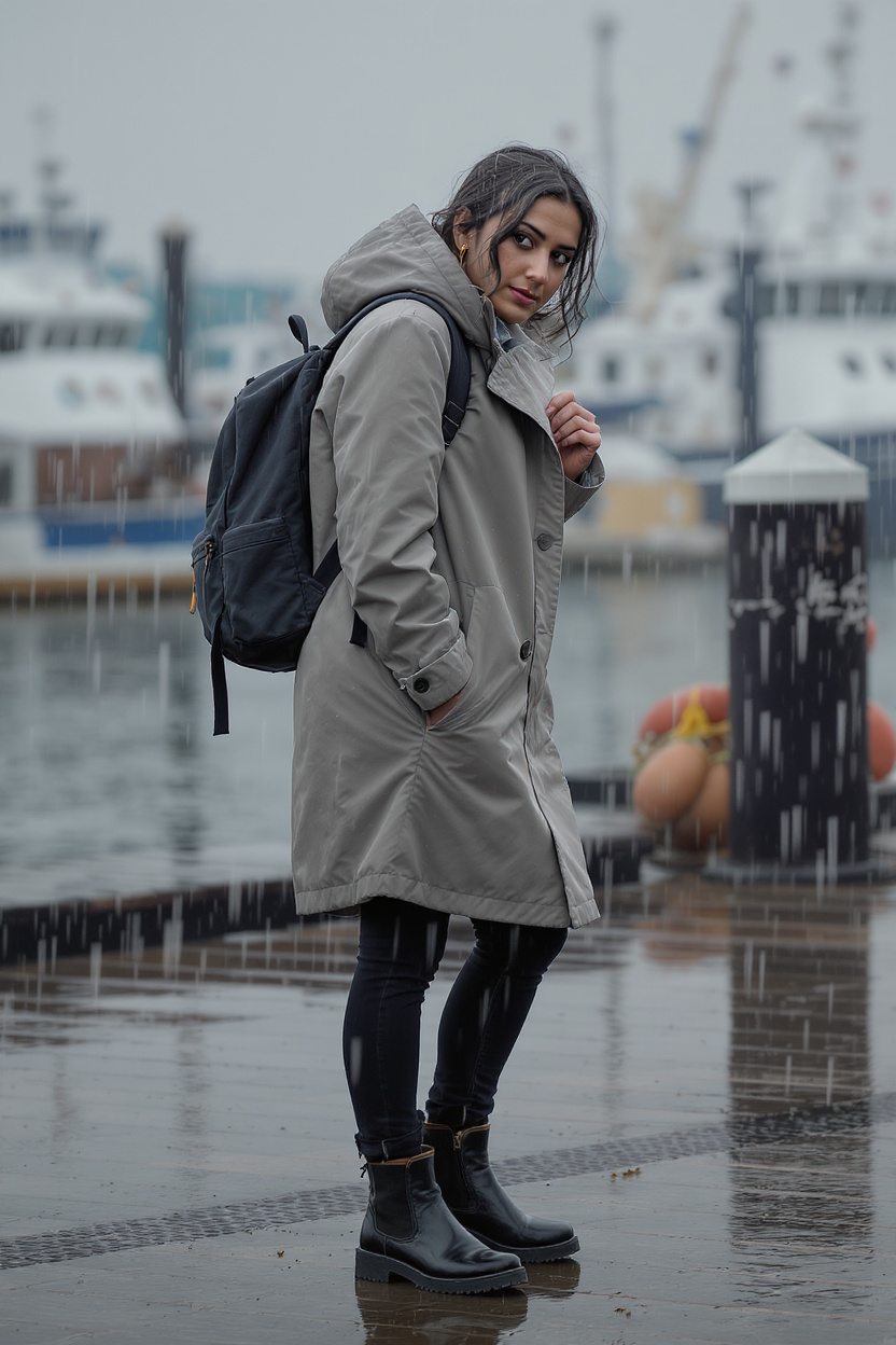 A lightweight waterproof trench layered over a soft chambray shirt and black slim-fit pants. Lug-sole Chelsea boots handle slippery docks. A compact backpack keeps essentials dry.