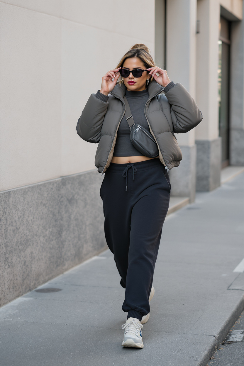 A cropped puffer jacket over a fitted mock-neck top and high-waisted joggers. Chunky sneakers add comfort and edge. A nylon crossbody bag keeps it functional. Finish with tinted sunglasses for a subtle streetwear feel.