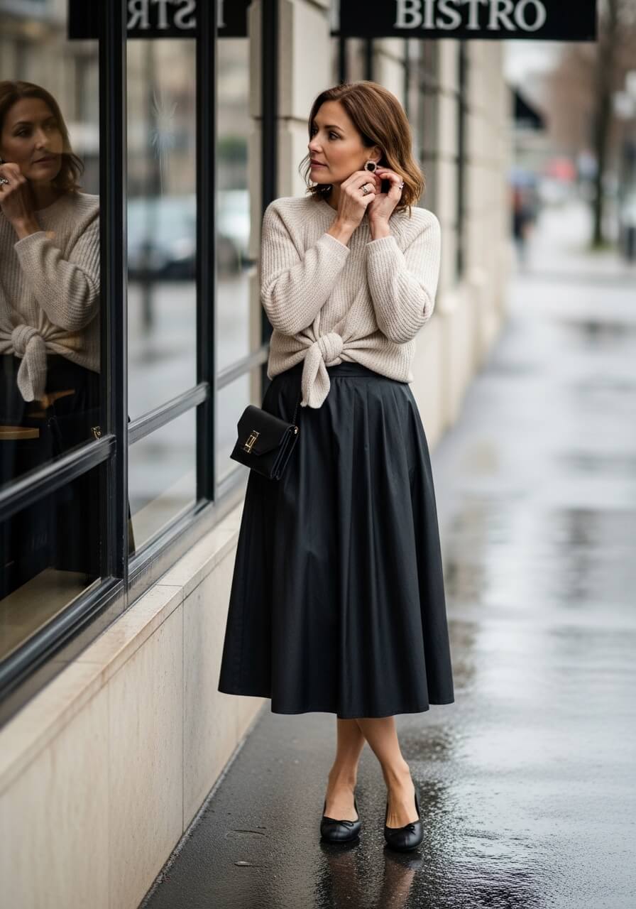 A water-resistant midi skirt paired with a fine knit sweater tucked in slightly at the front. Waterproof flats keep things practical. Swap your daytime tote for a sleek clutch and add bold earrings to transition seamlessly into evening.