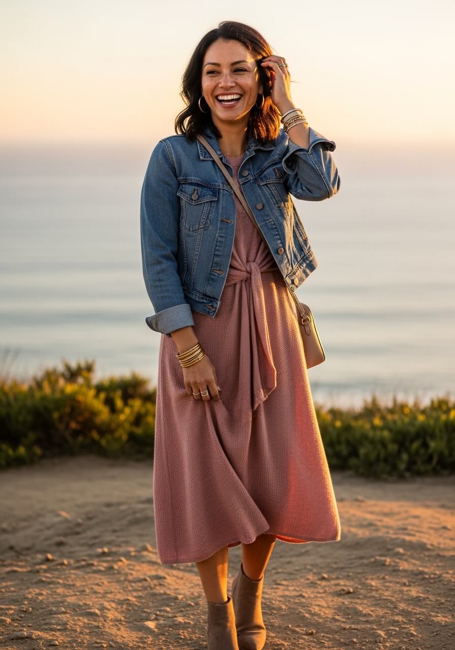 A soft knit midi dress in a muted rose tone paired with suede ankle boots. A cropped denim jacket adds structure. A small crossbody bag and layered bracelets bring just enough detail for those golden-hour photos.