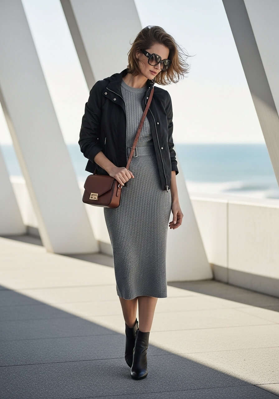 A sleek windbreaker layered over a fitted knit dress creates contrast between sporty and refined. Ankle boots keep it grounded. A structured crossbody bag and oversized sunglasses complete this unexpected pairing.