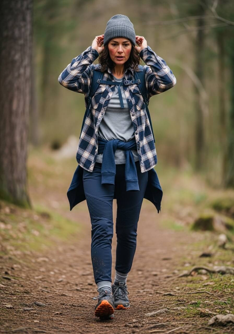 A flannel shirt layered over a fitted tee and stretch hiking pants. Trail sneakers handle uneven paths. A compact backpack carries essentials, while a chunky knit beanie adds warmth and personality.