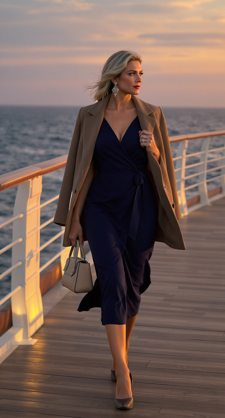 A midi wrap dress in a deep jewel tone paired with low block heels for stability. A structured mini bag sharpens the silhouette. Add a cropped wool jacket and statement earrings—elegant without feeling overdressed for a ship dinner.