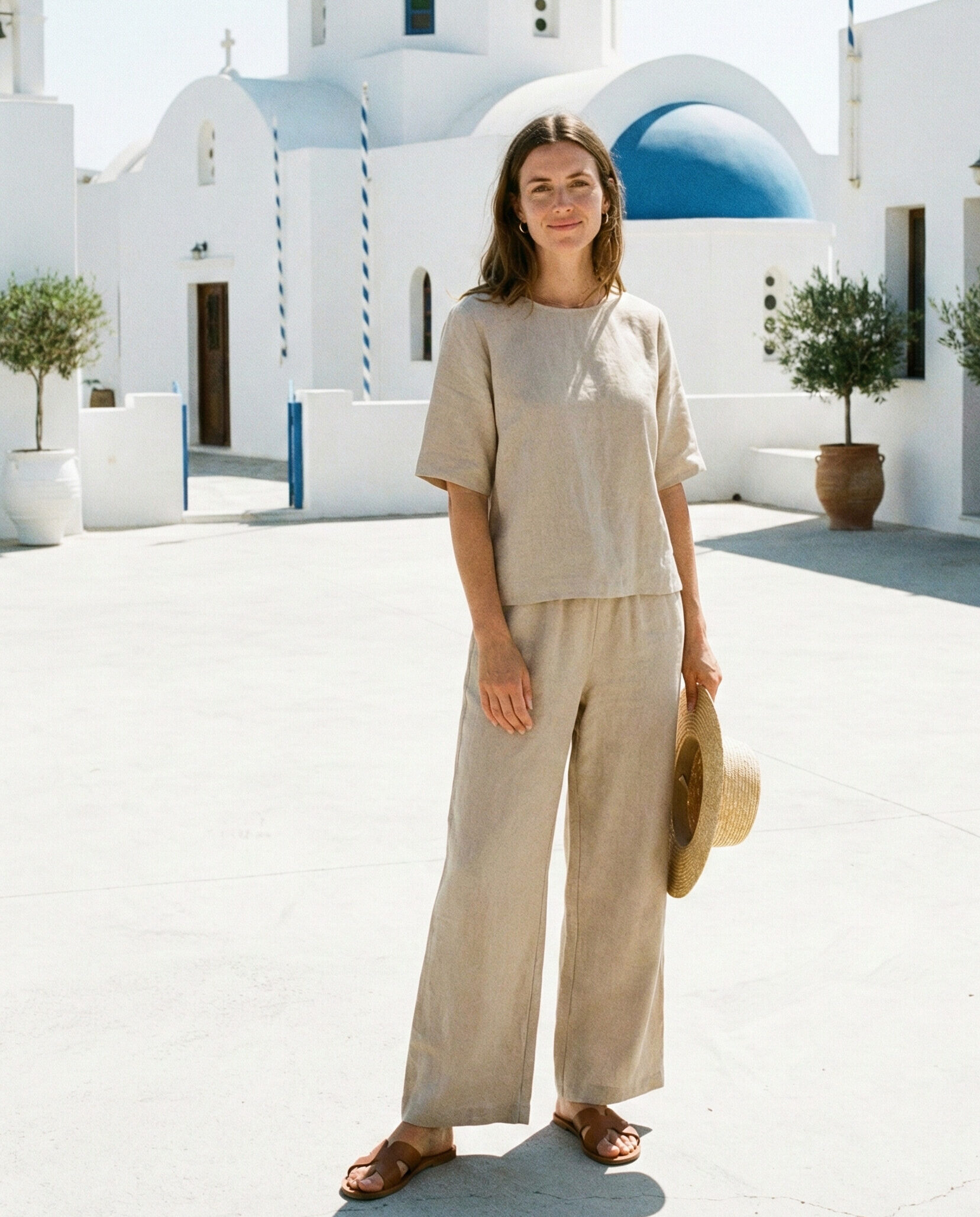 A soft knit tank paired with linen trousers creates an effortlessly chic look. The combination feels breathable and polished, making it suitable for museum visits, ferry rides, or relaxed afternoon strolls in Greek towns.