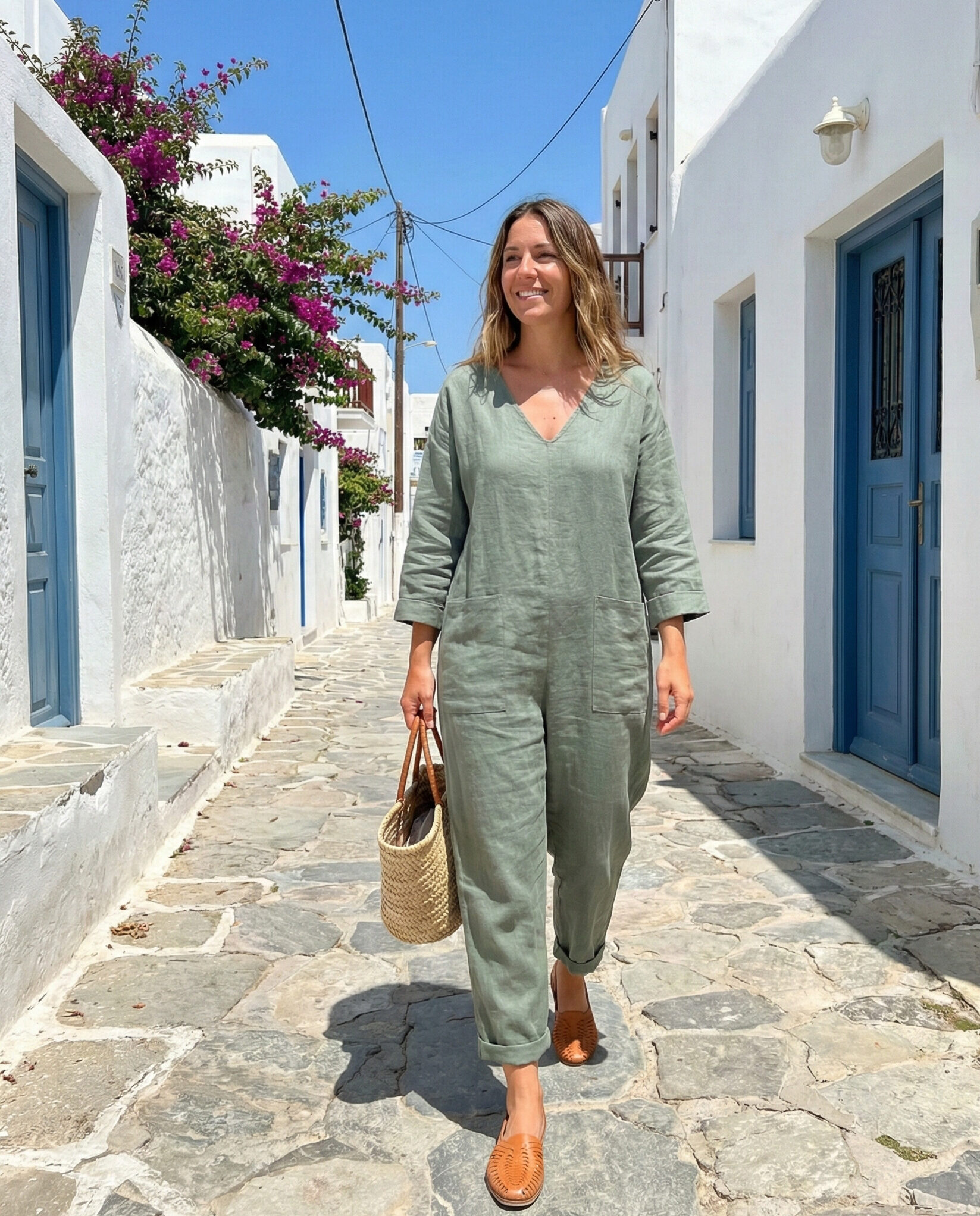 A relaxed-fit jumpsuit offers an easy one-piece solution for Greece travel. Breathable fabric and a loose silhouette keep things comfortable. Woven flats add texture and suit the laid-back island atmosphere perfectly.