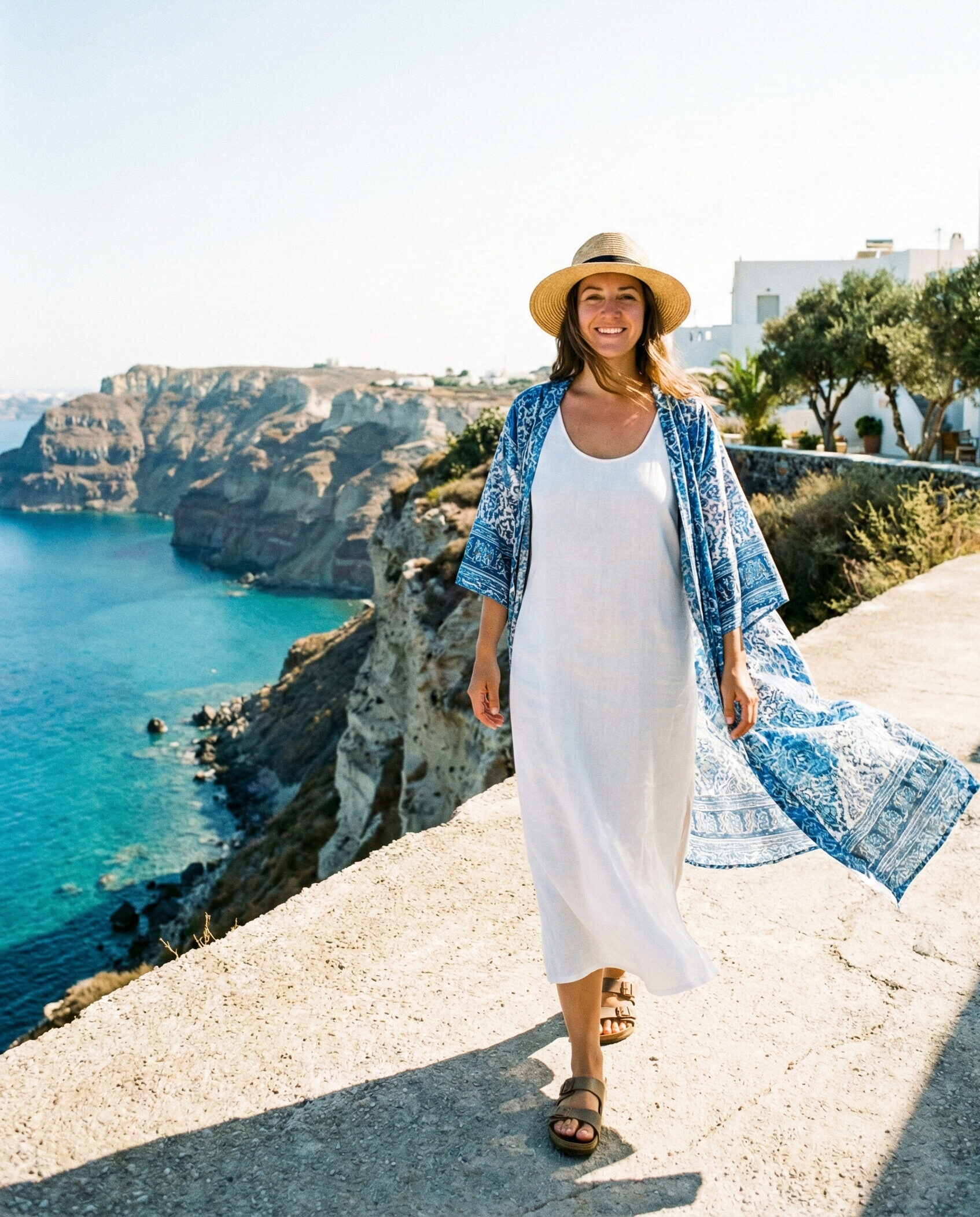 A lightweight kimono adds texture and elegance to a simple dress. It’s perfect for layering when temperatures change. This outfit feels breezy, feminine, and well-suited to Greece’s scenic backdrops.