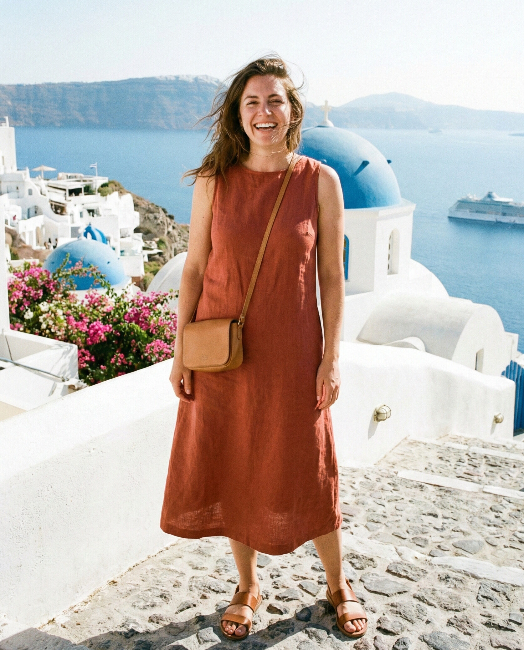 A linen midi dress is ideal for Greece’s warm climate, offering breathability and effortless elegance. The structured yet relaxed fit looks polished without feeling heavy. Paired with simple leather sandals, this outfit works beautifully for island walks, seaside lunches, and sightseeing days.