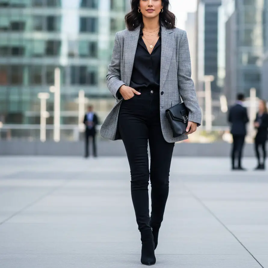 An oversized blazer layered over black jeans outfits for women creates a smart-casual vibe. Add a silk blouse, heeled ankle boots, and a clutch for a polished take on black jeans outfit ideas.