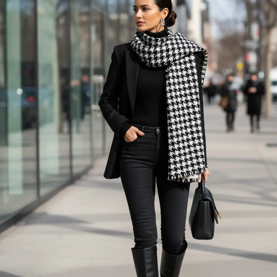 Go sleek with an all black jeans outfit layered with a turtleneck and tailored blazer. Add tall boots and a bold oversized scarf to break up the monochrome while staying polished for winter outings.