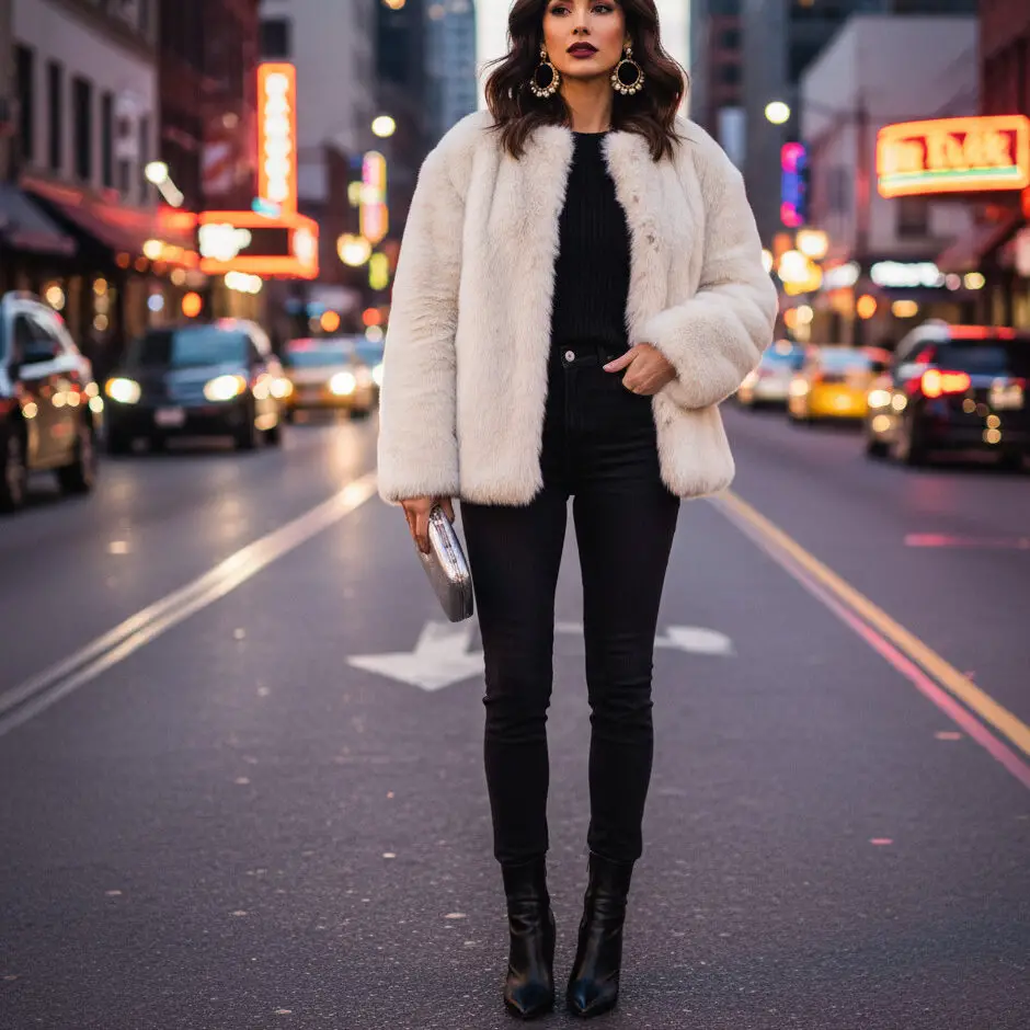 Elevate a black jeans and boots outfit with a plush faux fur jacket. Add a fitted knit top and statement earrings for an evening-ready look that blends comfort and luxury.