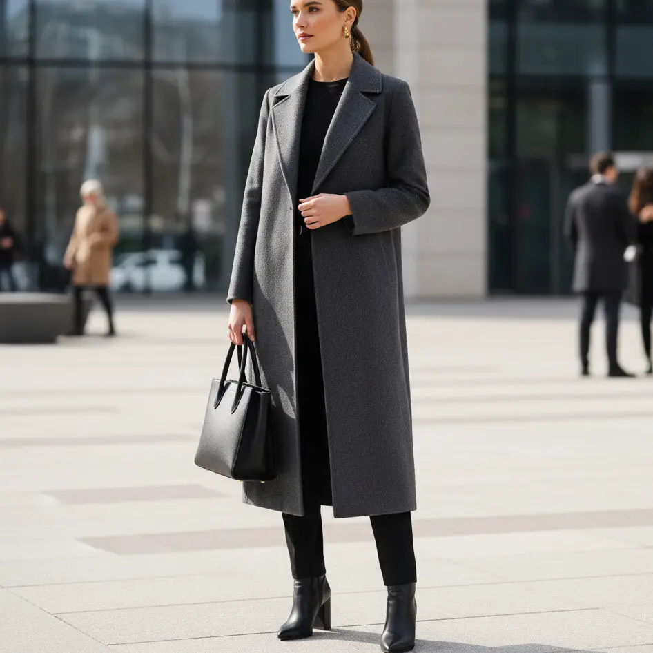 Style a long wool coat over slim black pants outfit winter essentials. Pointed boots and a structured tote elevate the outfit, making it versatile enough for office meetings or evening dinners.