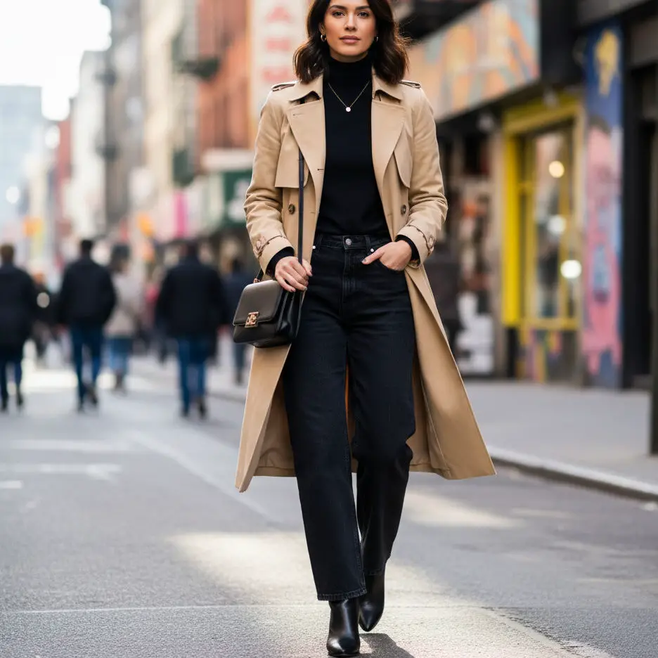 A trench layered over black wide leg jeans outfit ideas looks timeless. Pair with a turtleneck, ankle boots, and a crossbody bag for the perfect black jeans outfit aesthetic in cold weather.