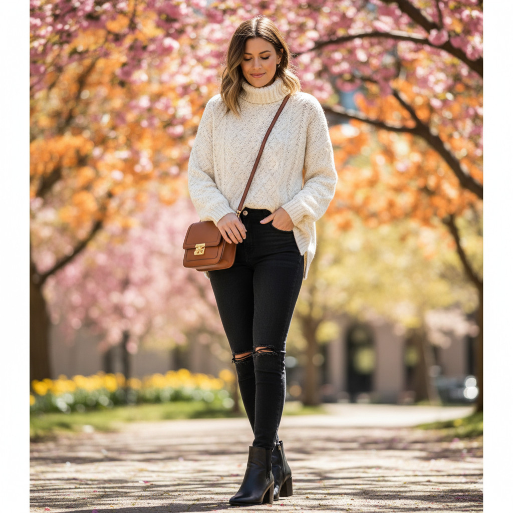 A chunky knit sweater paired with black skinny jeans creates the perfect balance of cozy and sleek. Add ankle boots and a crossbody bag for an easy black jeans outfit idea that works from brunch to errands.