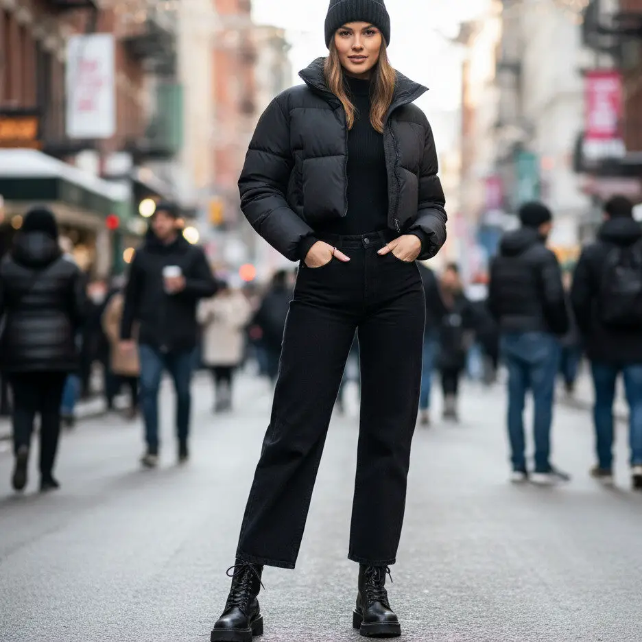 Black wide leg jeans outfit styling with a cropped puffer jacket feels modern and practical. Pair with lace-up boots, a beanie, and minimal jewelry for cold weather outfits that stay chic and functional.