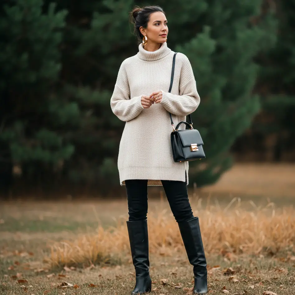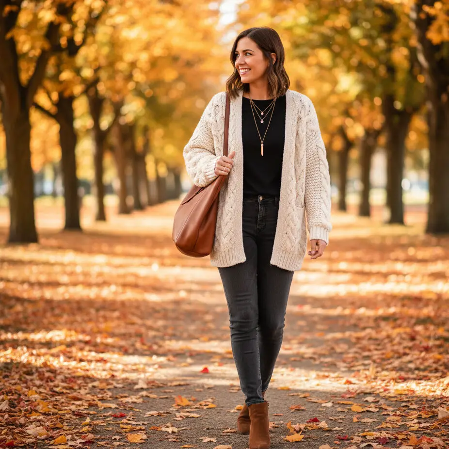 Pair a chunky cardigan with fitted black jeans and boots for a relaxed vibe. Add layered necklaces and a tote to create a chic black jeans fall outfit that transitions perfectly into colder months.