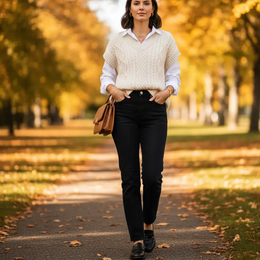 Layer a crisp white shirt under a knit vest with straight-leg black jeans. Add loafers or ankle boots for an updated black jeans fall outfit that blends office polish with seasonal comfort.
