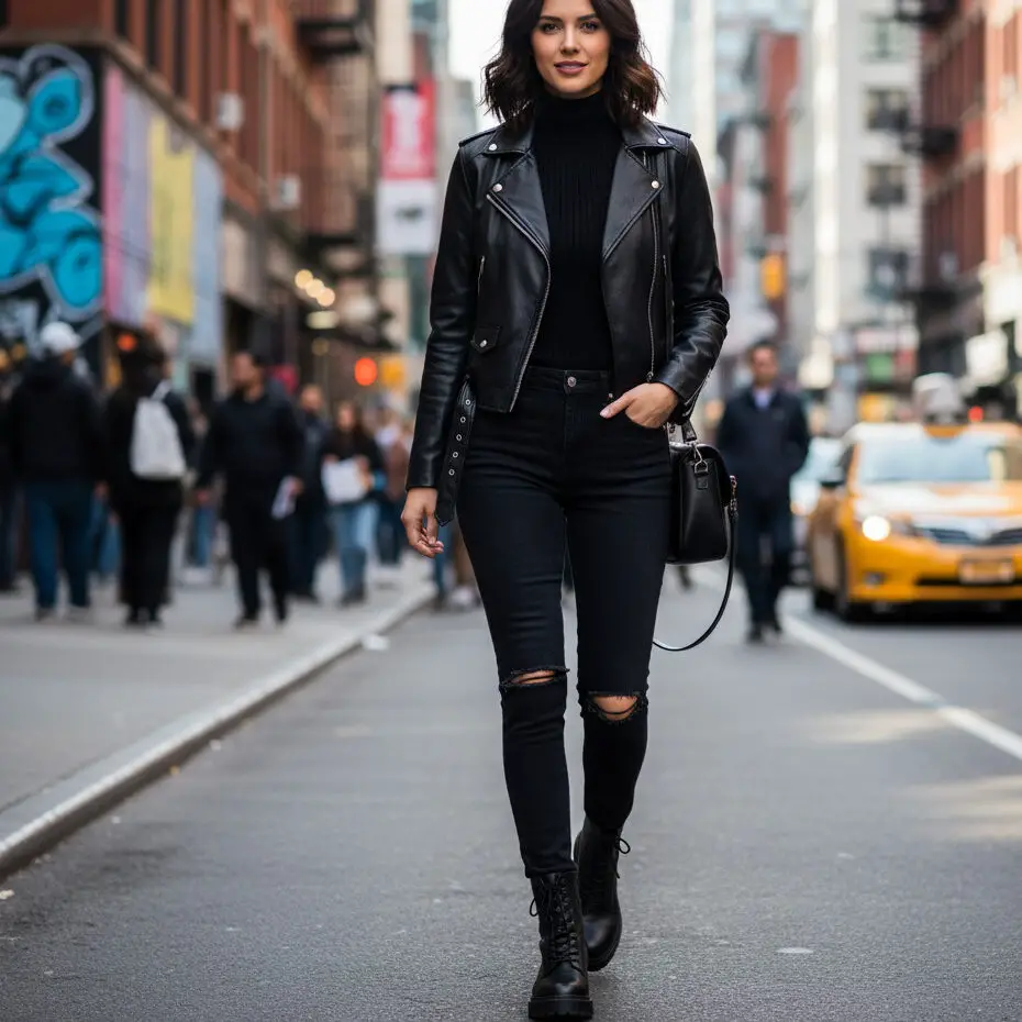 For an edgy black denim jeans outfit, layer a leather jacket over a fitted turtleneck. Finish with combat boots and a satchel for a street-style-ready look that channels a bold black jeans outfit aesthetic.