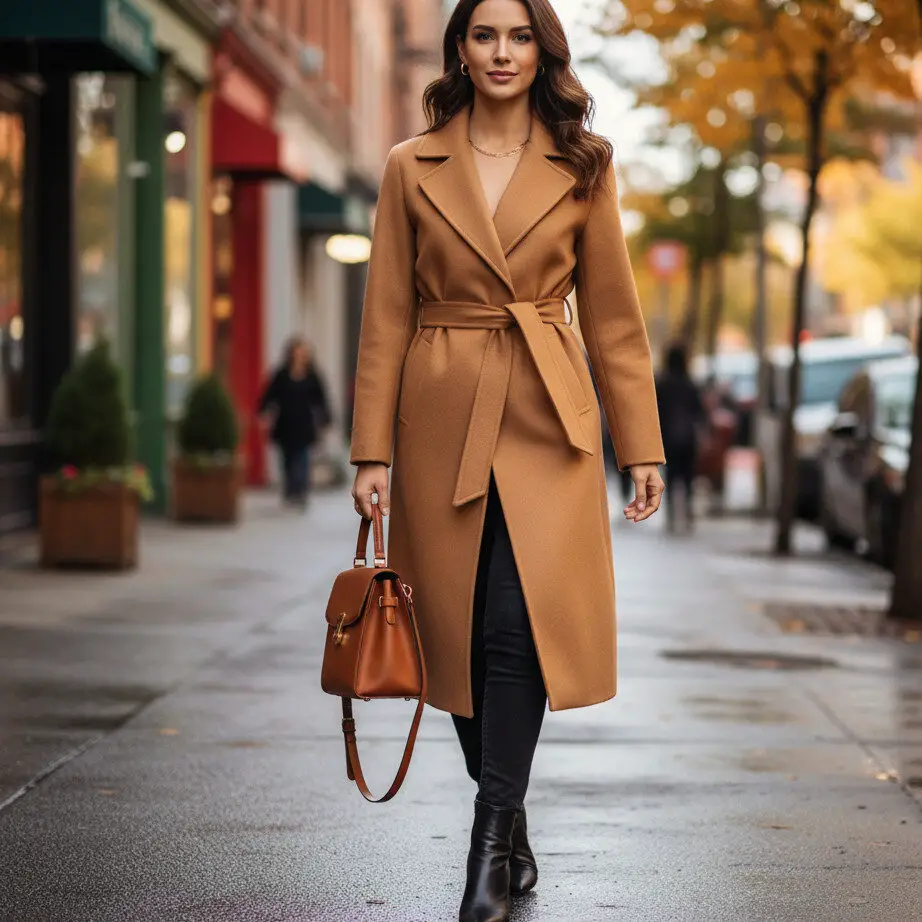 Finish strong with a belted wool coat styled over fitted black jeans and boots. Add a leather satchel and minimal jewelry for cold weather outfits that exude timeless elegance.