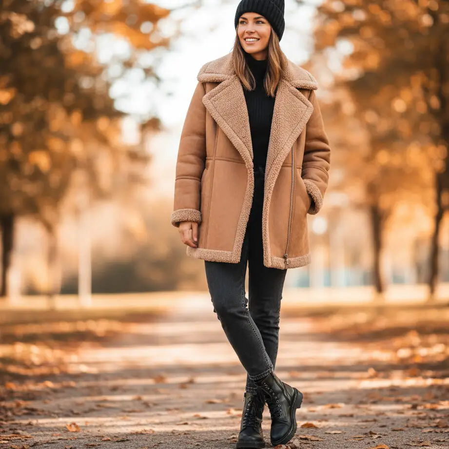 Choose a shearling coat layered over black denim jeans outfit styling for instant cozy vibes. Add combat boots and a knit beanie for a casual winter look that’s both warm and stylish.