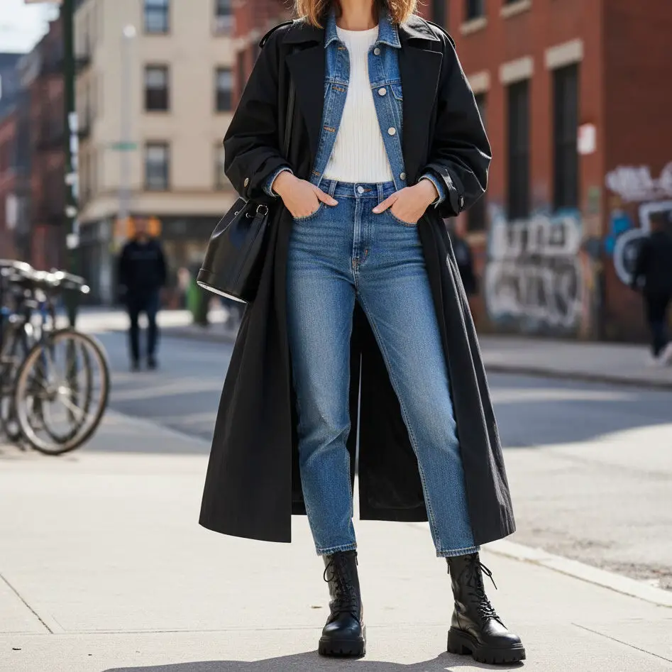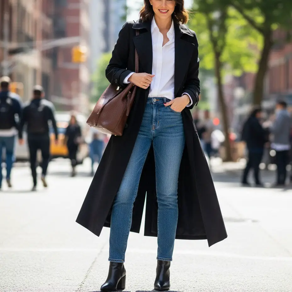 Pair a black trenchcoat outfit with a crisp white button-down and blue jeans. Add ankle boots and a leather tote for a polished, city-ready ensemble that feels both classic and modern.