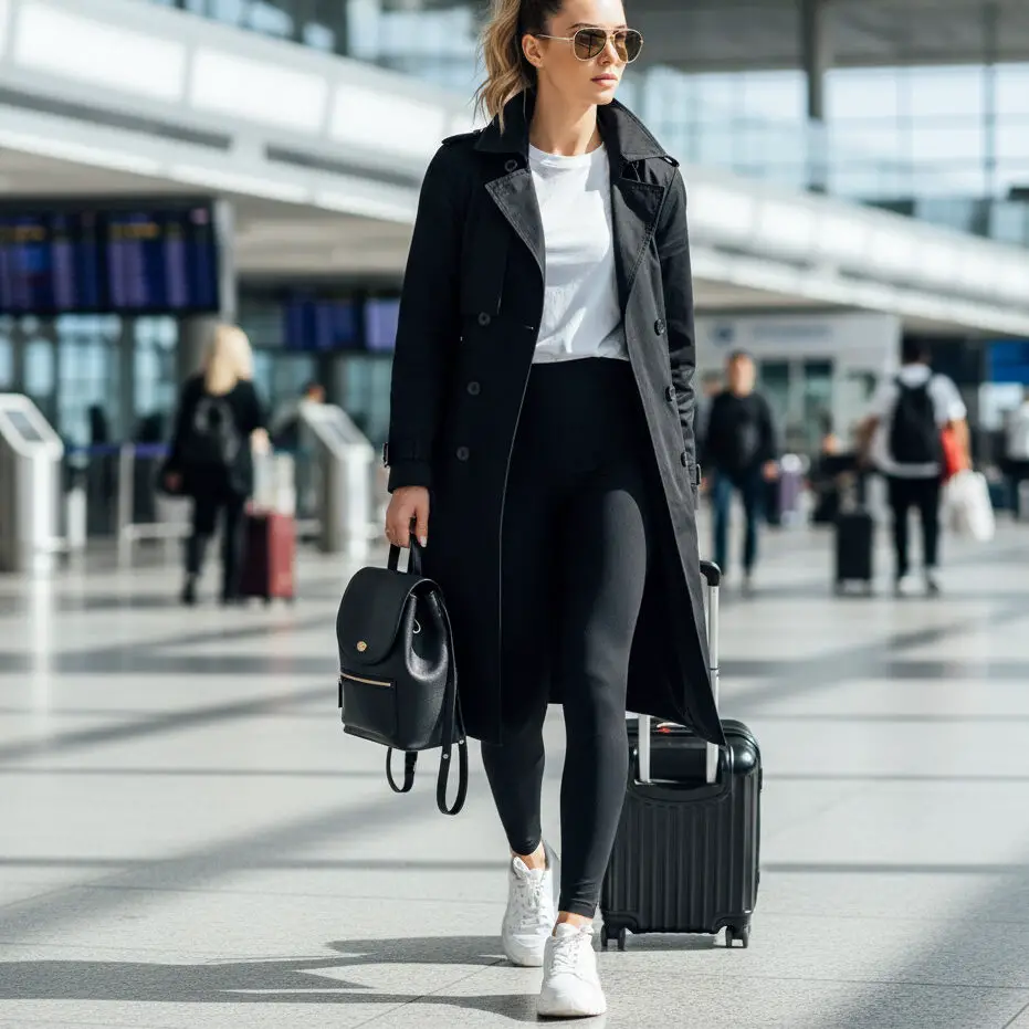 Wear your black coat outfit for women with leggings, a white tee, and trainers. A structured trench adds refinement, turning your airport outfit into a statement moment.