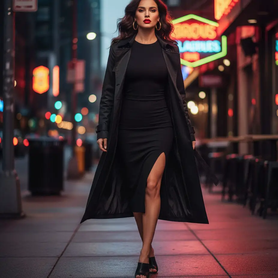 Drape a black trenchcoat outfit over a bodycon dress and heeled mules. Add red lipstick and gold hoops for a look that’s sophisticated yet sultry — perfect for night events.