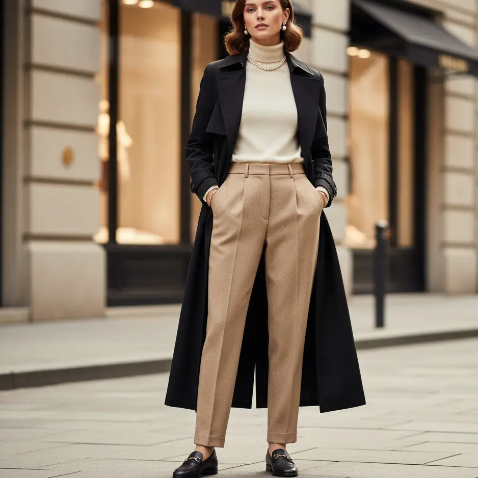 Combine a black trench coat outfit with beige trousers, a cream cashmere sweater, and loafers. Add pearls or gold accents for a timeless old money outfit look.