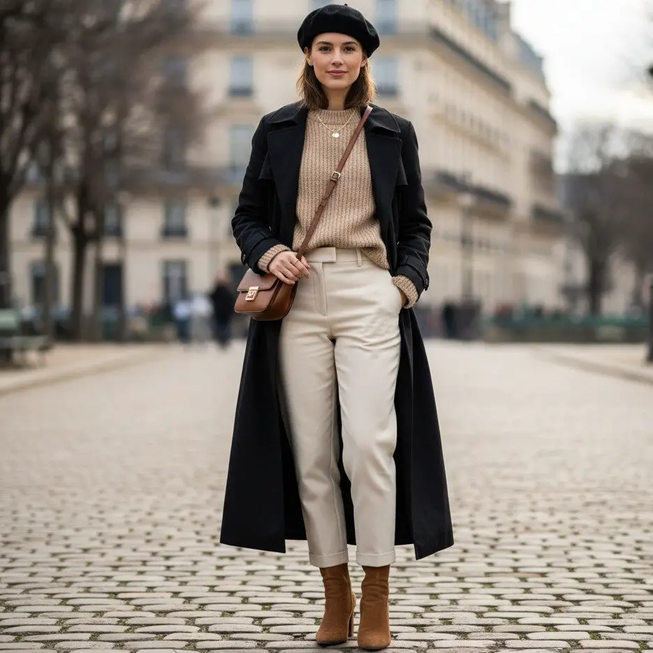 Layer your black trench coat outfit over a beige knit and cream trousers. Complete with suede ankle boots and a wool beret for a French-inspired trench coat outfit winter style.