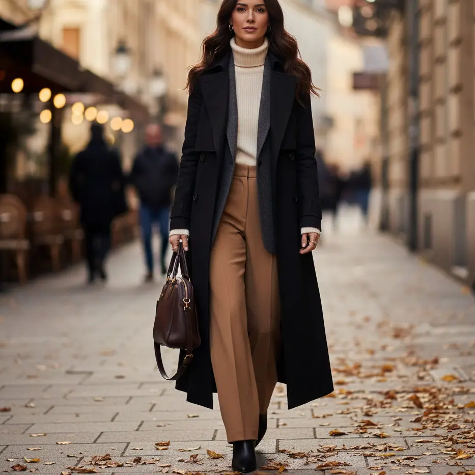 Layer a long trench coat outfit over a turtleneck, blazer, and wide-leg pants. Finish with ankle boots and a leather satchel — the perfect transitional cold weather outfit.