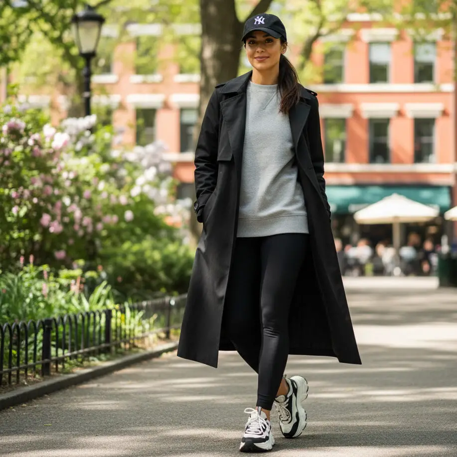 Wear your black trench coat outfit with a grey sweatshirt, leggings, and chunky sneakers. Add a baseball cap for a relaxed trench coat outfit women vibe that’s perfect for errands or travel.